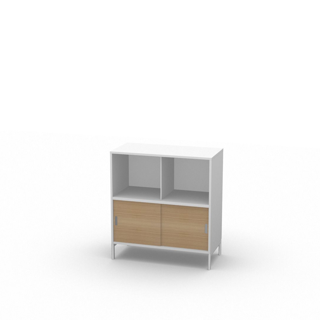 Skåpet har skjutdörrar nertill och öppet upptill.