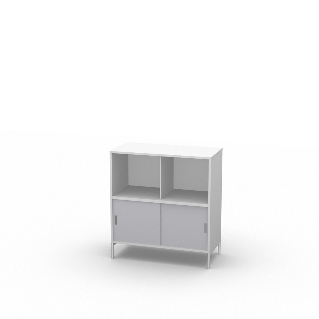 Skåpet har skjutdörrar nertill och öppet upptill.