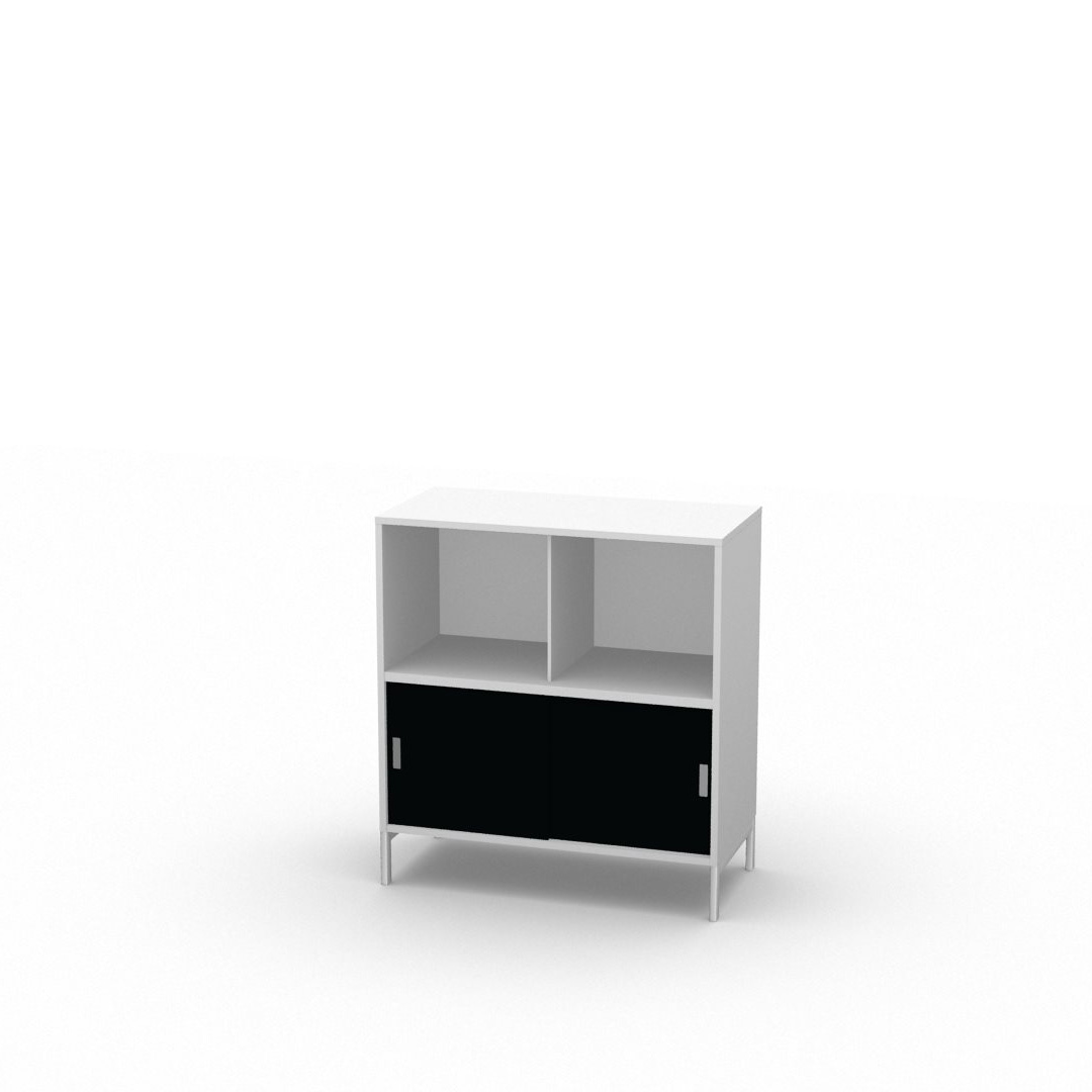 Skåpet har skjutdörrar nertill och öppet upptill.