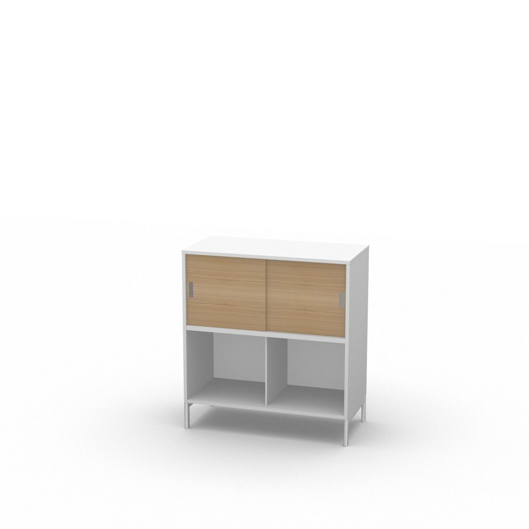 Skåpet har skjutdörrar upptill och öppet nertill.