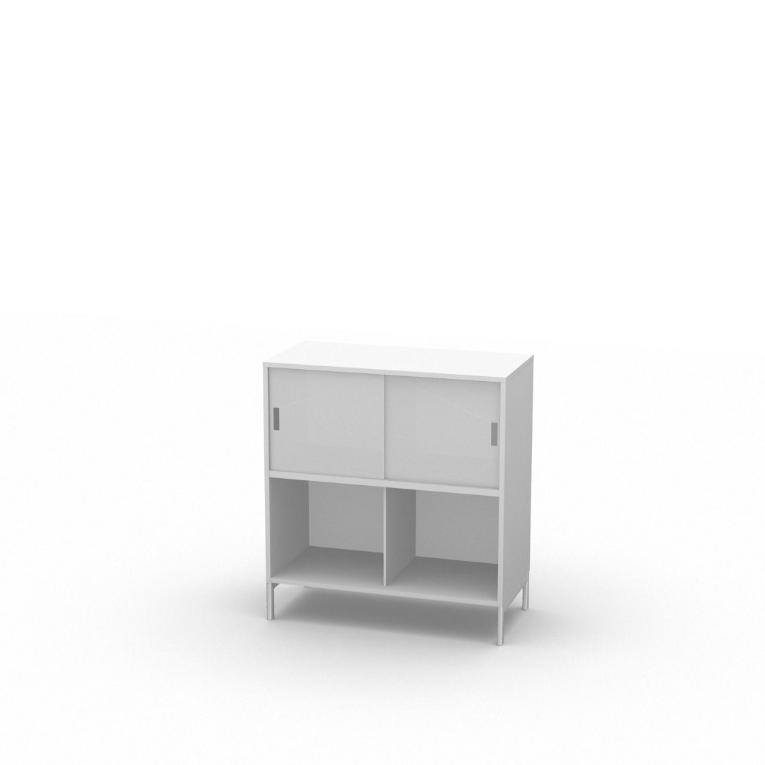 Skåpet har skjutdörrar upptill och öppet nertill.