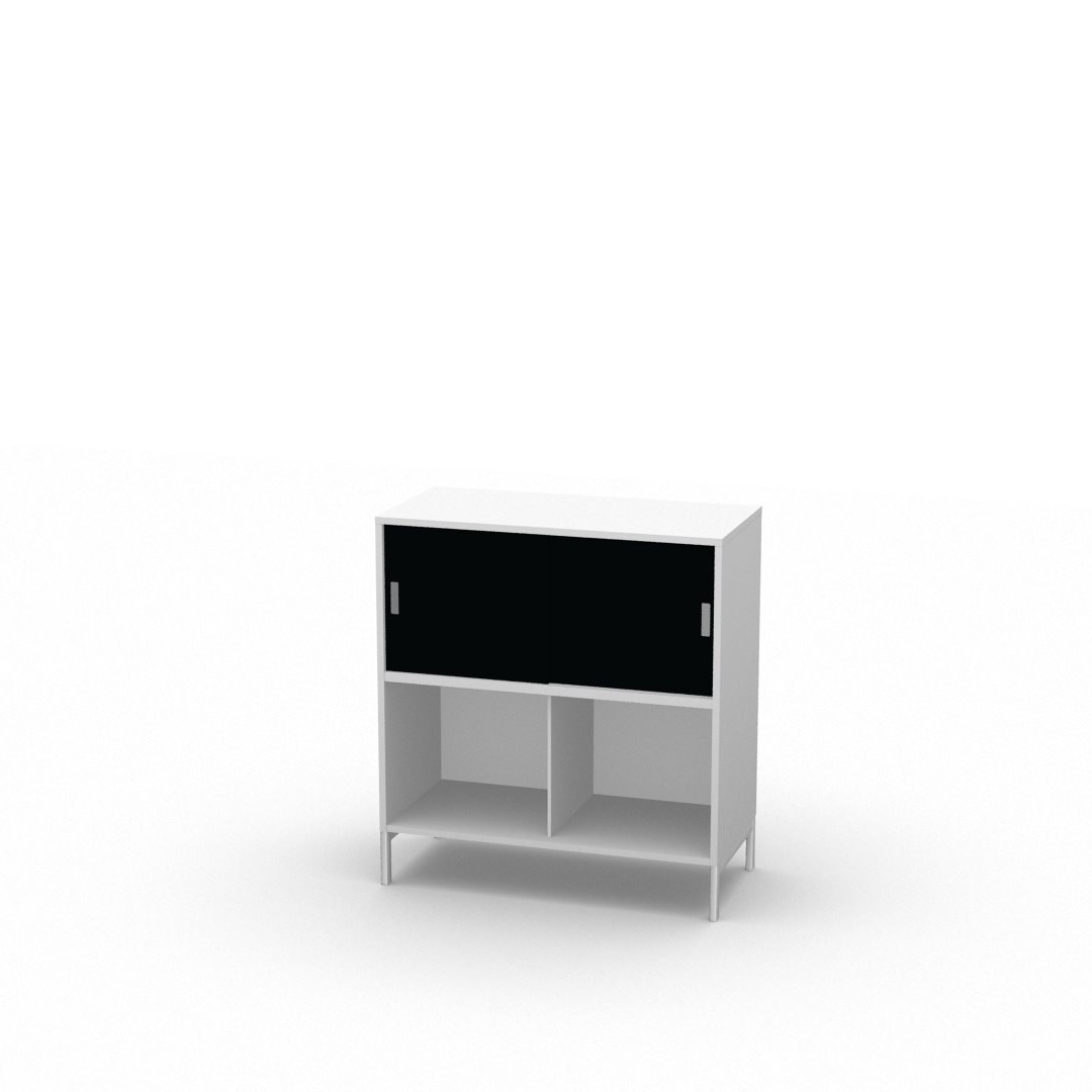 Skåpet har skjutdörrar upptill och öppet nertill.