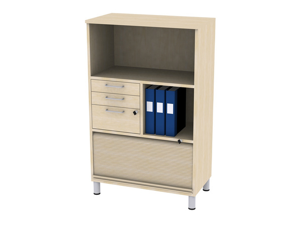 Öppen förvaring med delad jalusi och låsbar lådsats.Välj mellan sockel eller ben.Bredd: 801 mmDjup: 435 mmHöjd: 1292 mm