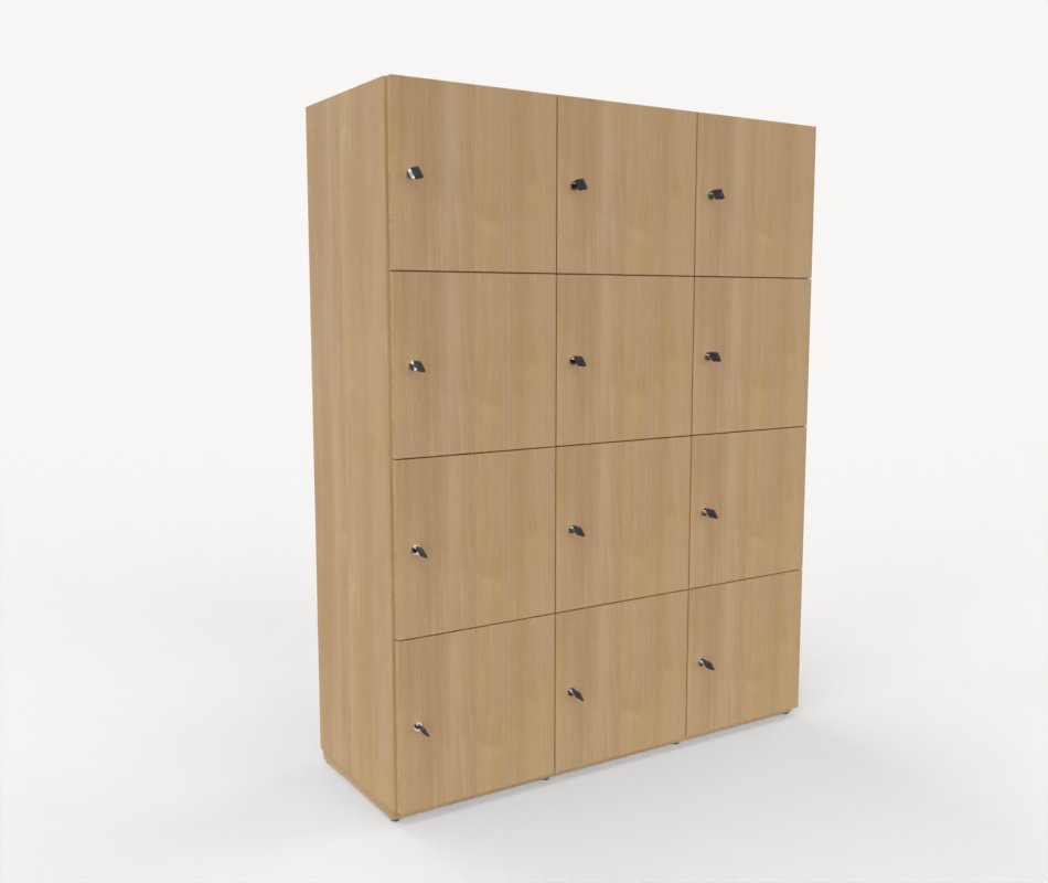 Detta skåp är med 12 st låsbara fack med nyckel och högerhängda dörrar.