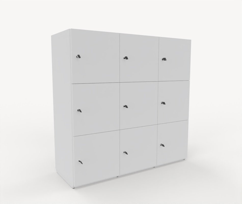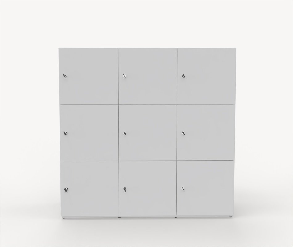 Detta skåp är med 9 st låsbara fack med nyckel och högerhängda dörrar.