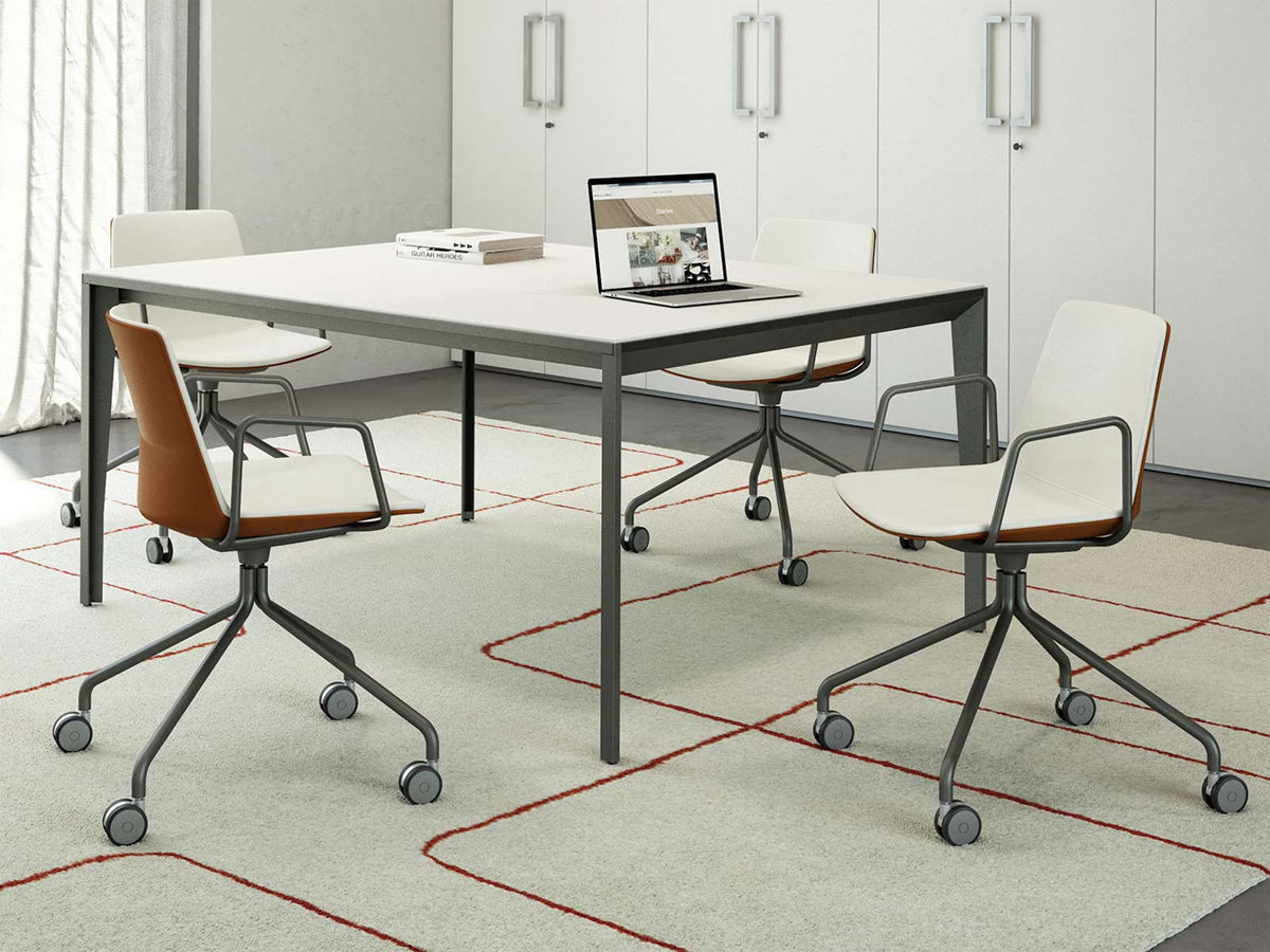 Litet och stilrent rektangulärt mötesbord i tålig laminat. Passar det moderna konferensrummet med sitt unika benstativ.✔ Italienskt elegant mötesbord✔ Möjlighet att integrera ellutag i bordsskivan✔ Skiva tillverkad i reptålig laminat