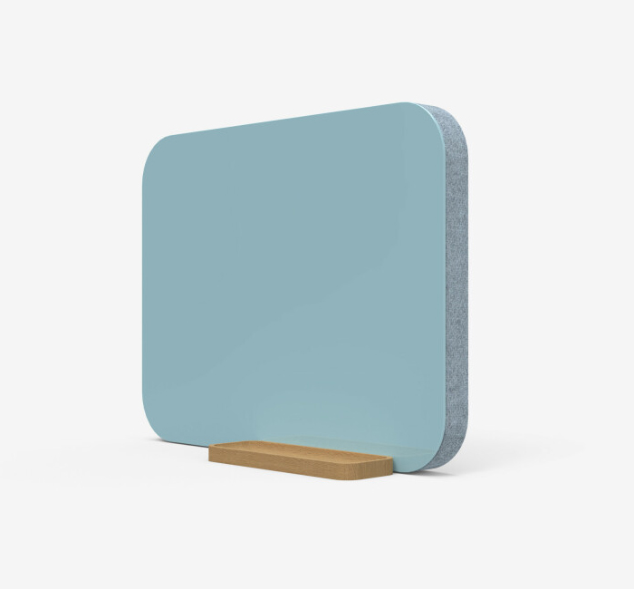 Bordsskärm med skrivyta i glas och tygklädd ljudabsorberande baksida. Mood Fabric