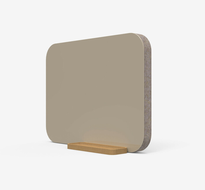 Bordsskärm med skrivyta i glas och tygklädd ljudabsorberande baksida. Mood Fabric