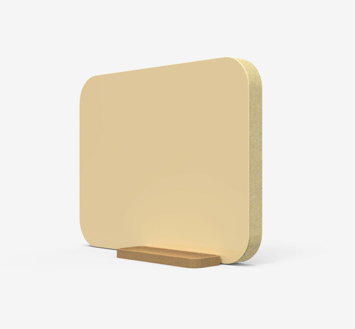 Bordsskärm med skrivyta i glas och tygklädd ljudabsorberande baksida. Mood Fabric