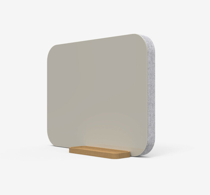 Bordsskärm med skrivyta i glas och tygklädd ljudabsorberande baksida. Mood Fabric