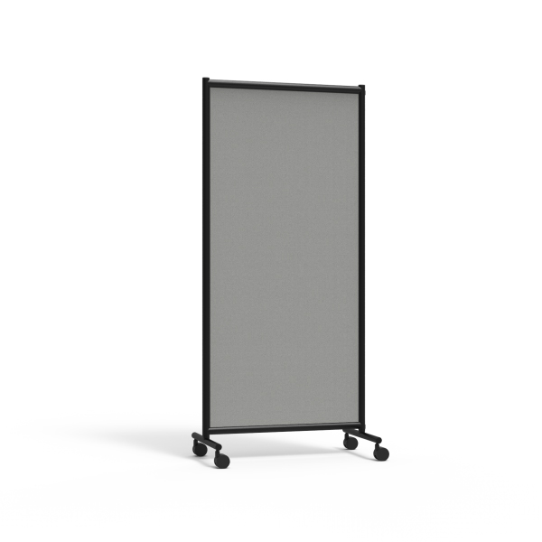 ONE Screen singel är en mobil skärmvägg med hjul och svart ram.