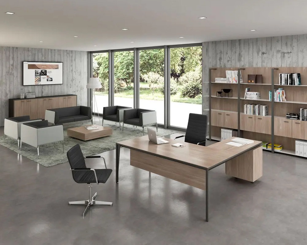 Stilrent italienskt L-format skrivbord med integrerad lådhurts.