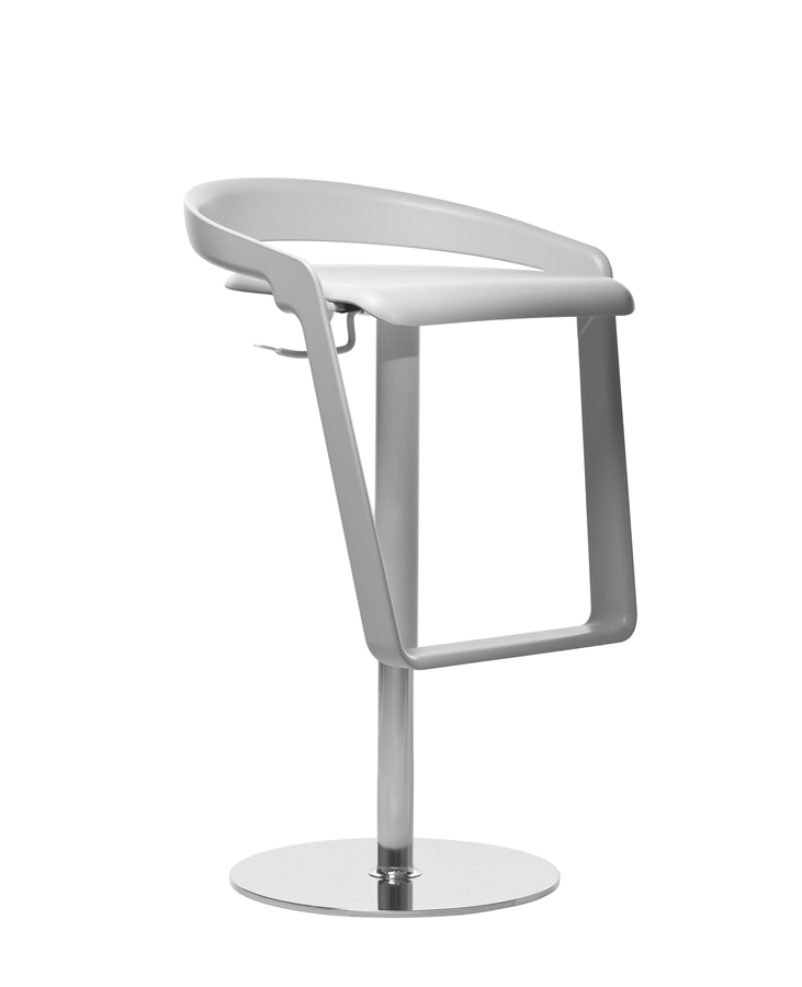 Höj- och sänkbar stilren barstol i gjuten PUR (polyretan) med stålrörsstomme.