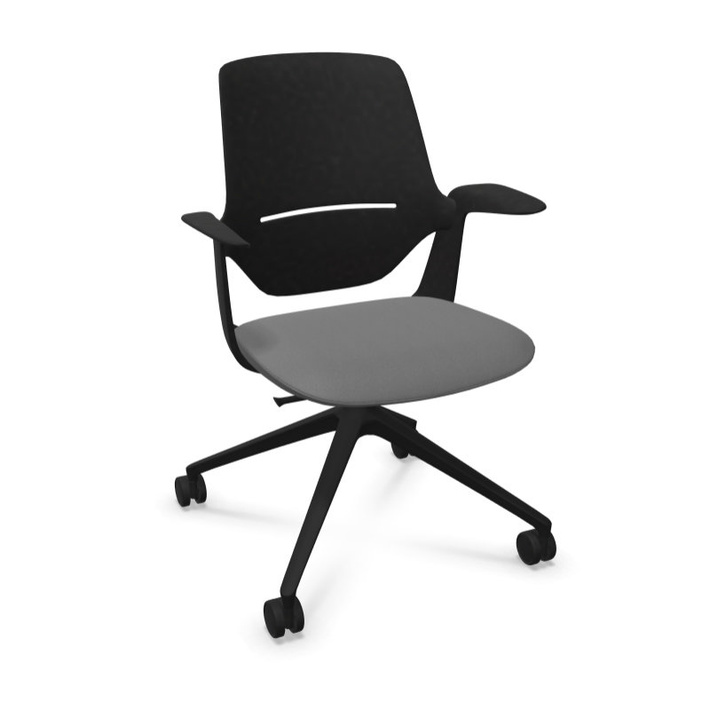 Svart eller ljusgrå plast. 4-stjärnigt stativ på hjul. Svart med svarta hjul vid svart rygg.