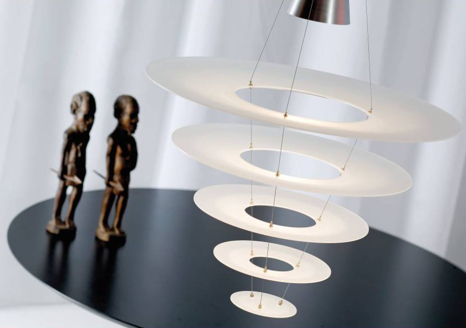 Enigma avger bländfri belysning för stora rum med sin innovativa men ändå simplistiska form. Skärmarna släpper in en omfattande ljusmängd i rummet och ljuskällan som finns inuti konen är inte synlig från någon vinkel. Tunna aluminiumvajrar håller skärmarna perfekt horisontella medan de skapar en illusion av en svävande armatur. De formsprutade skärmarna bildar en vacker form och den matta finishen på ovansidan framhäver texturens estetik.