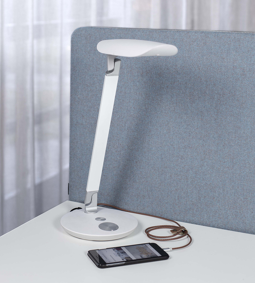 Modern och stilren skrivbordslampa med LED-belysning. Finns i svart eller vit design.