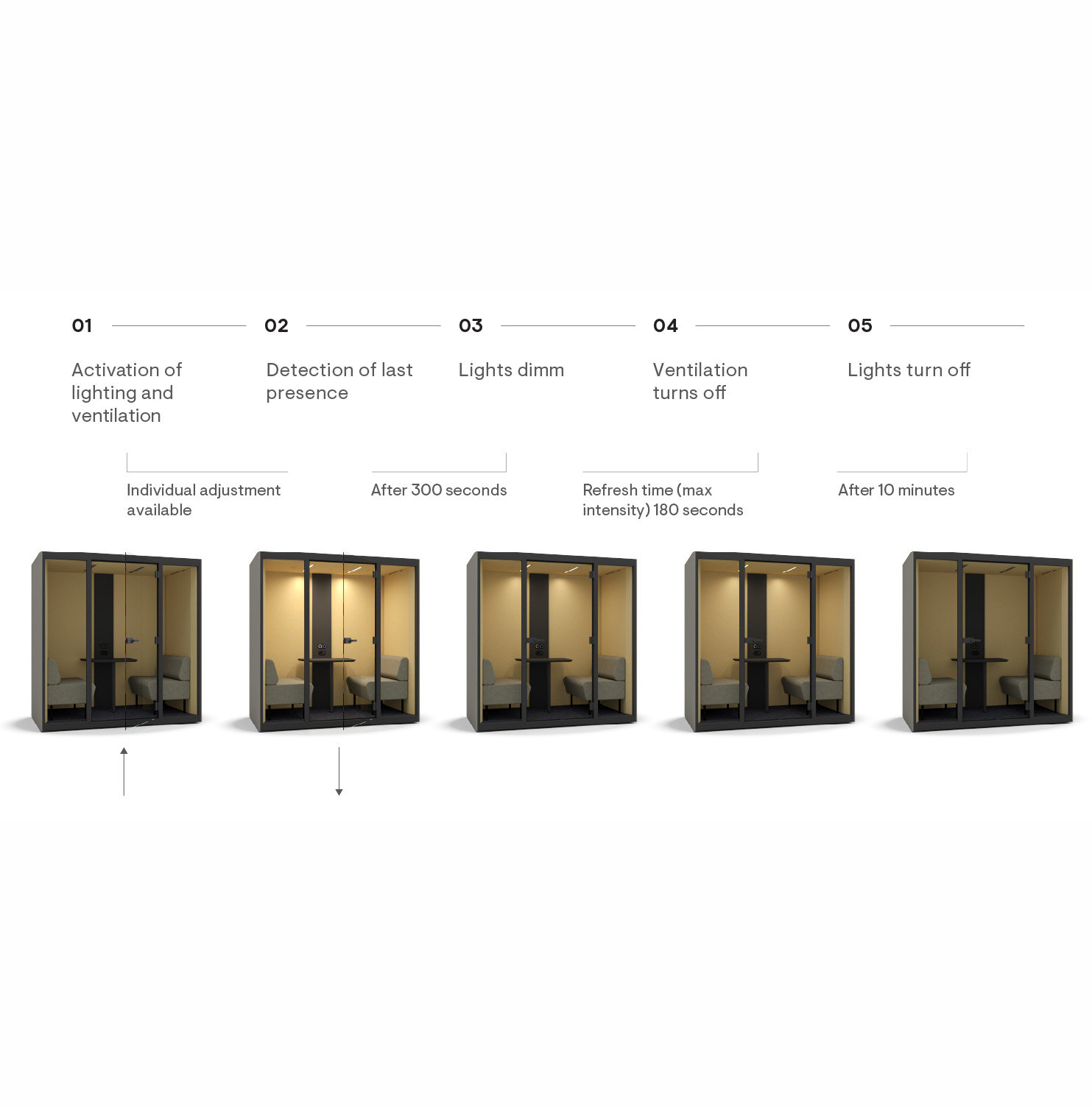 Tyst rum med dolda hjul designad för att skapa en ljudisolerad och bekväm arbetsmiljö.