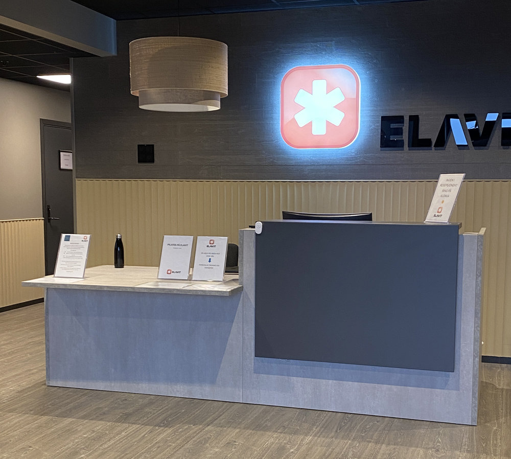 Rak receptionsdisk med en nedsänkt del samt sidopaneler.